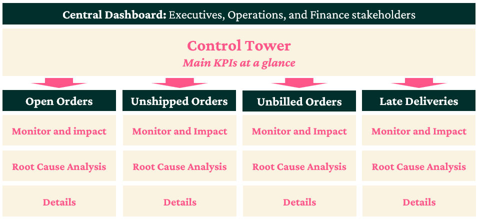 The Control Tower surfaces the most common operational pain points - such as open orders, unshipped orders, unbilled orders, and late deliveries - and presents them in a clear, business-driven view. This gives the Order Fulfillment Manager a holistic understanding of performance and trends over time, which helps the manager to quickly assess the situation and targeted action where it matters most.