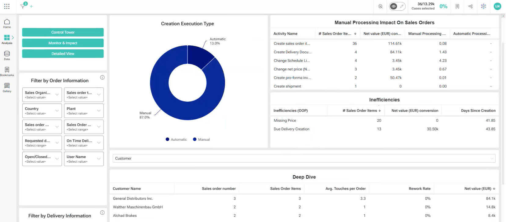 Visualizes process variants and deviations to identify exception-heavy paths and support standardization and continuous process improvement.