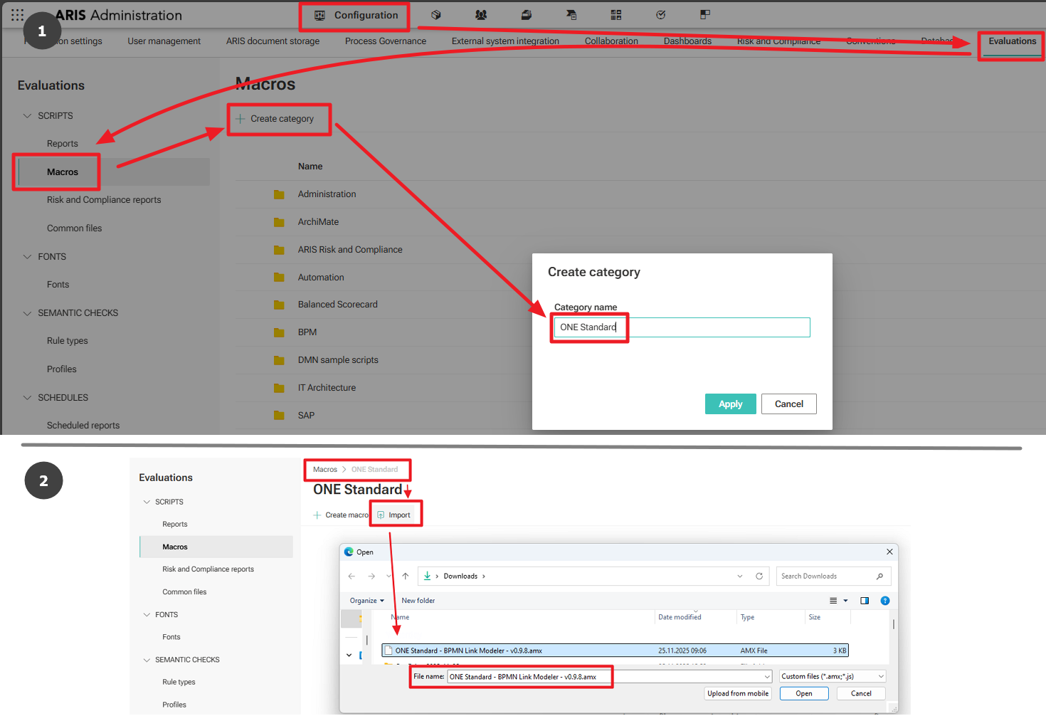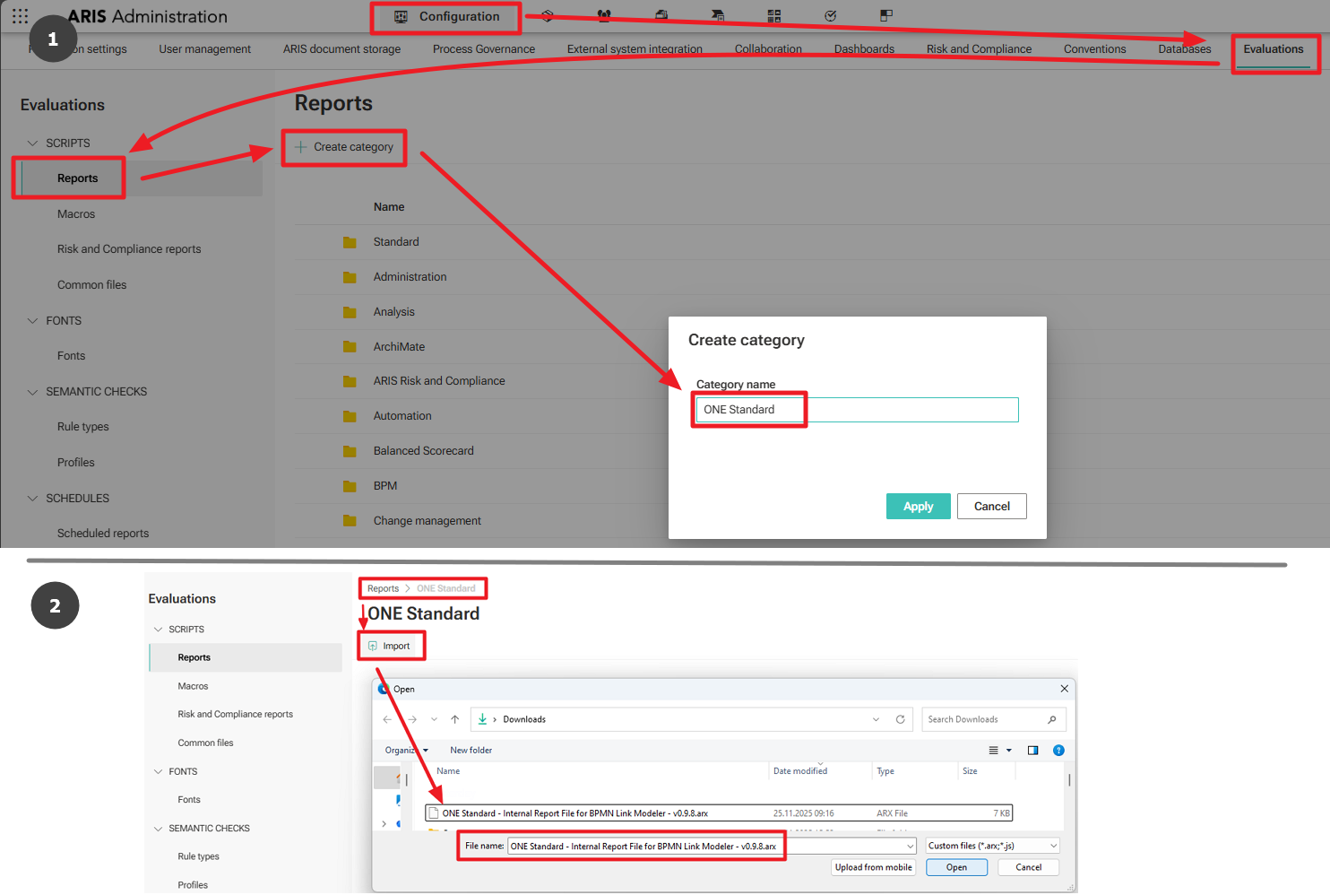 - Navigate to Configuration → Evaluations → Reports. Create a new category using Create Category (for example, named ONE STANDARD).