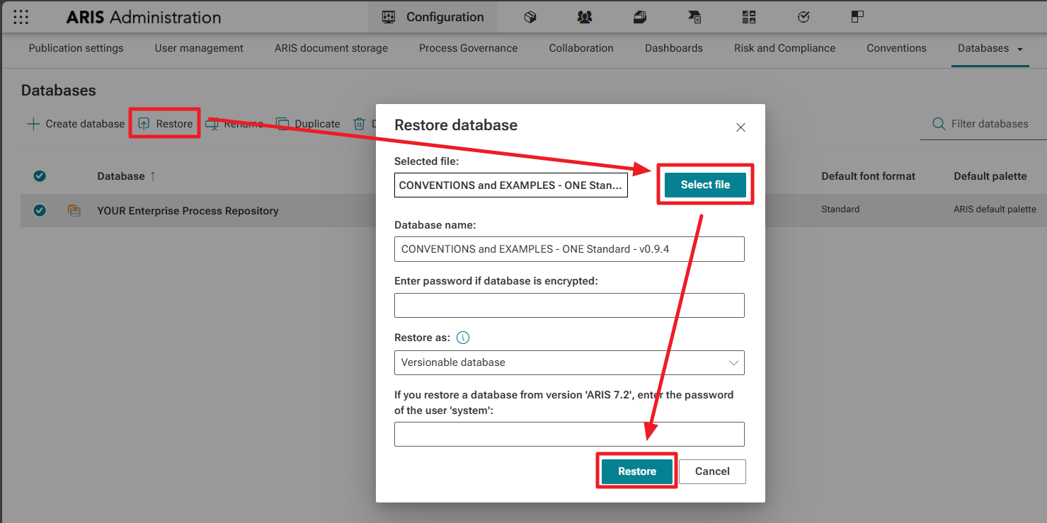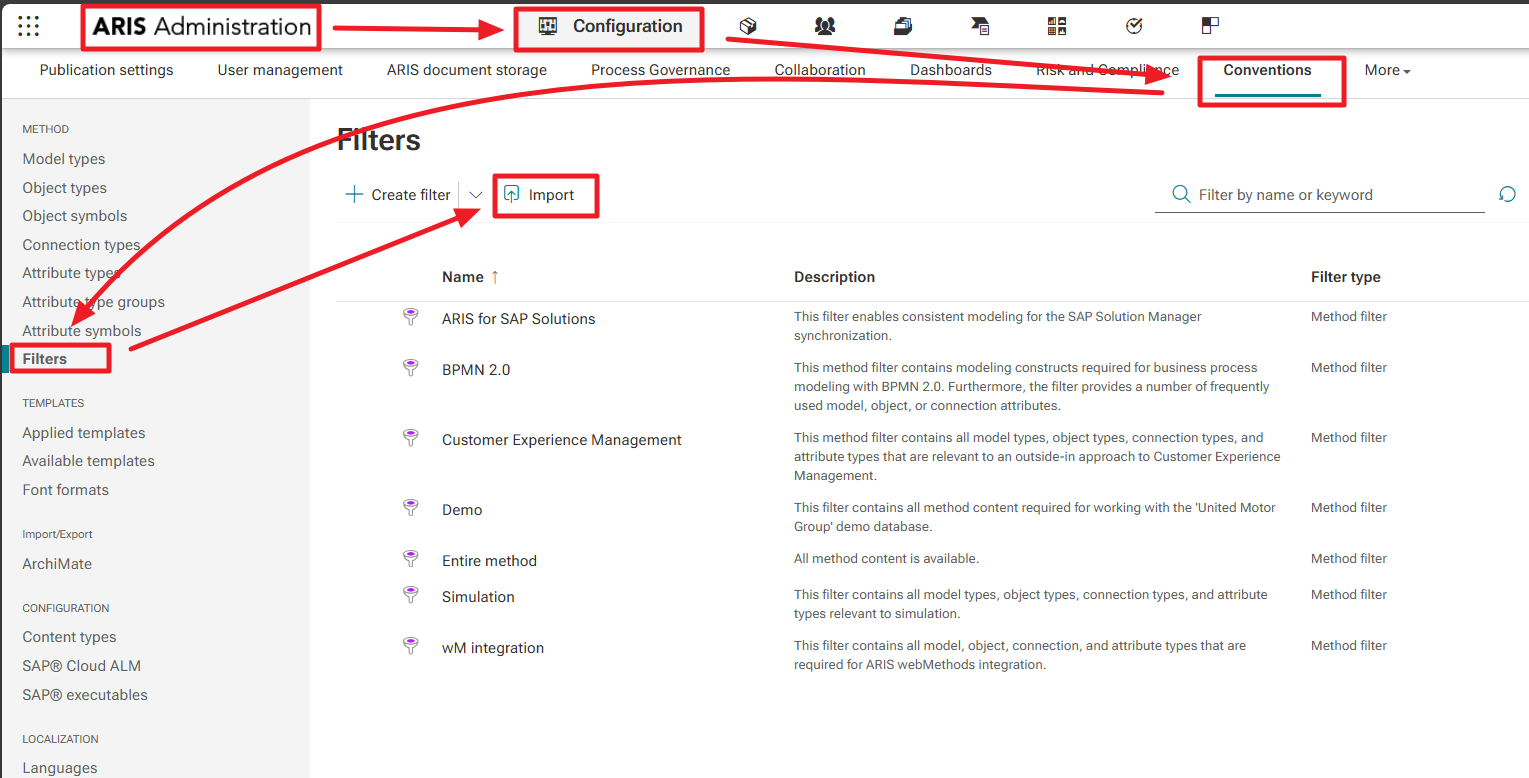 - You have successfully imported the Method Filter, restored the Project Template Database, imported the Conventions and Examples Database, and imported the BPMN Link Modeler as well as the Semantic Check, and finally you imported the suitable Content Type Configuration.