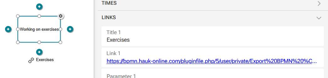 - External links: How can I attach an external link (e.g. a Moodle assignment link) directly to a task or data object so that it is visibly displayed and clickable for end users? → The goal is that the link is not only stored in the attribute window but also clearly visible in the diagram itself (for example as an icon, symbol, or tooltip).