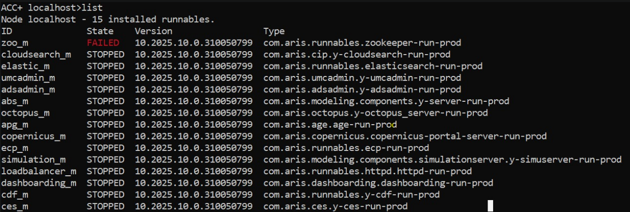 On Windows Server 2022 with ARIS 10.2025, the zoo_m (ZooKeeper) runnable consistently shows FAILED in ACC+, while all other runnables remain STOPPED. Attempted restart and cleanup, but zoo_m does not start successfully. Looking for guidance on root cause and clean reinstallation/reset of zoo_m.