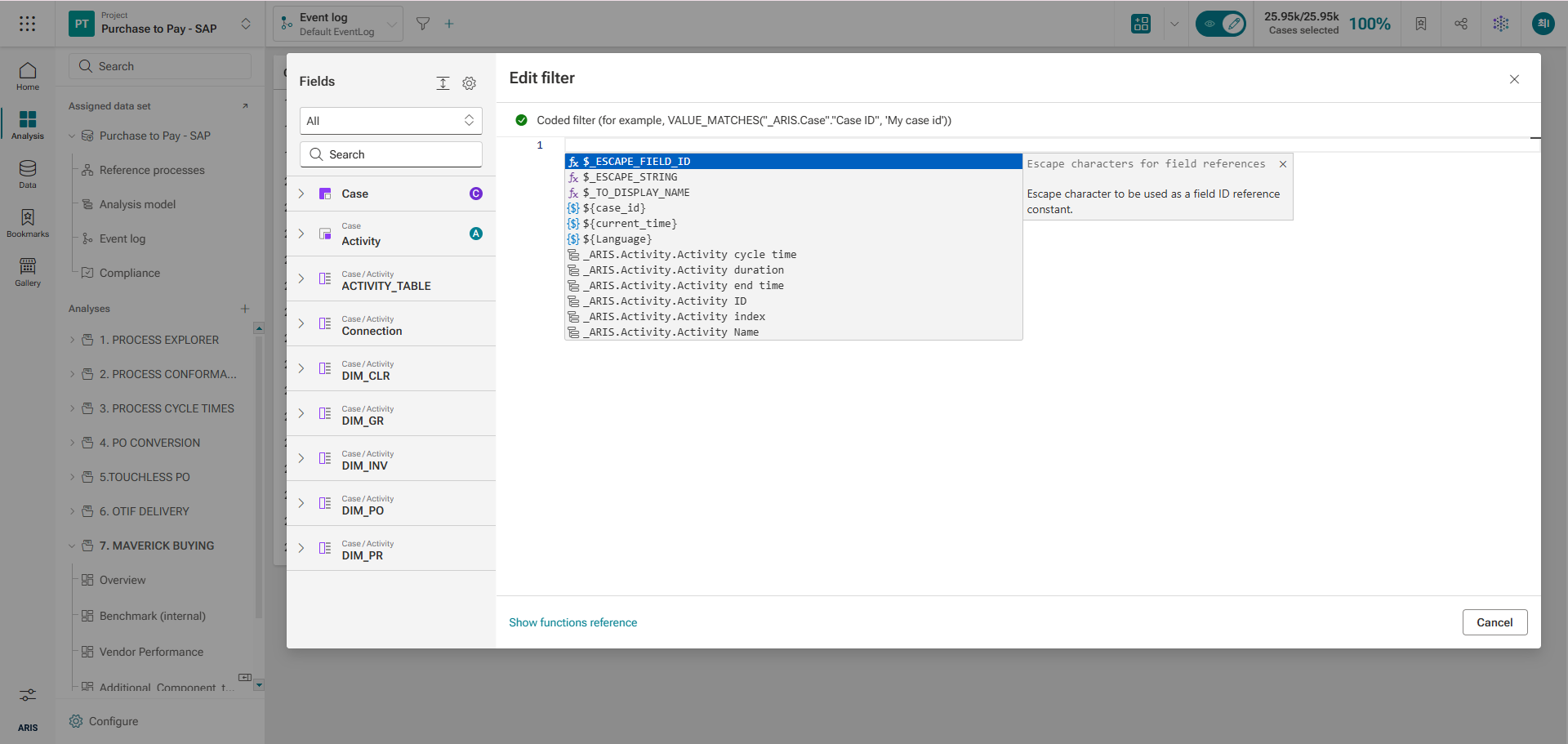 I am familiar with the basic descriptions provided by the Ctrl+Space shortcut. However, I am looking for practical examples of how these operators are used in real-world ARIS Process Mining.